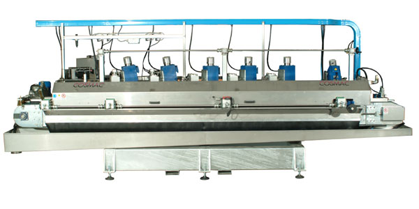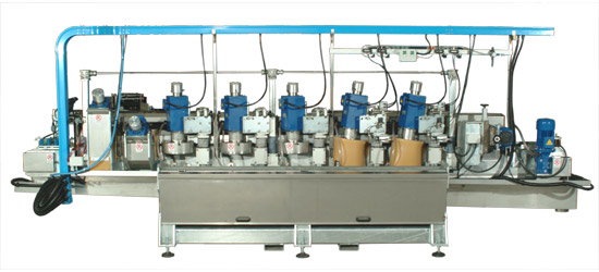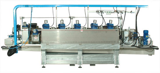 Tutte le teste elencate sono regolabili in orizzontale e verticale, in più le teste con mole raggiate hanno la possibilità di inclinazione su due assi. Il nastro di tasporto è guidato centralmente con cinghia sez. B applicata nella parte inferiore , a velocità di avanzamento variabile. La macchina vanta caratteristiche importanti per il buon funzionamento e semplicità di operazioni come: cambio formato, cambio utensile, regolazione dello stesso in fase di piazzamento macchina. La struttura della macchina è costruita in tubolare di grosso spessore ad alta resistenza e zincato a caldo; tutte le parti a contatto con l\\\'acqua sono in acciaio inox.