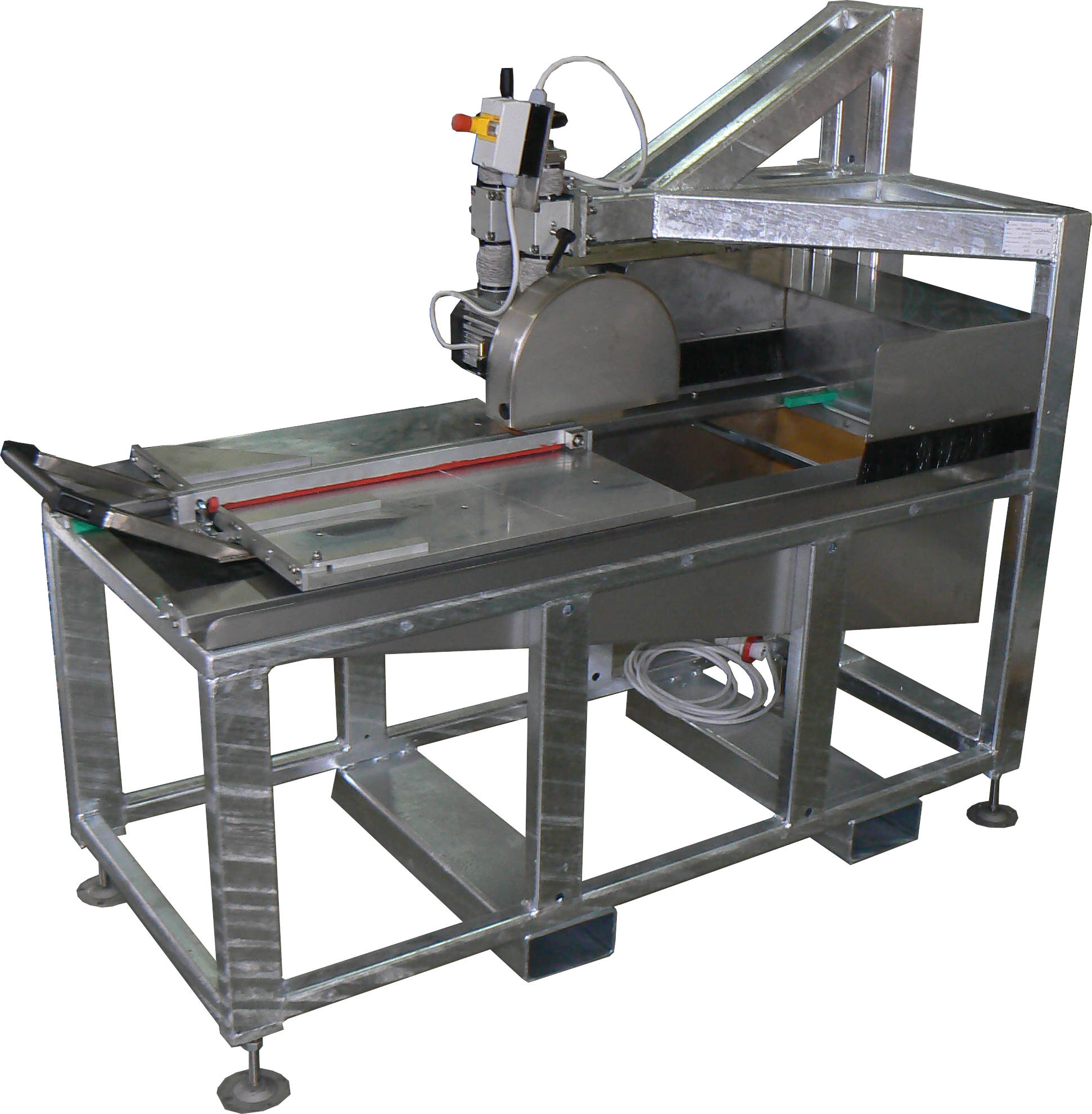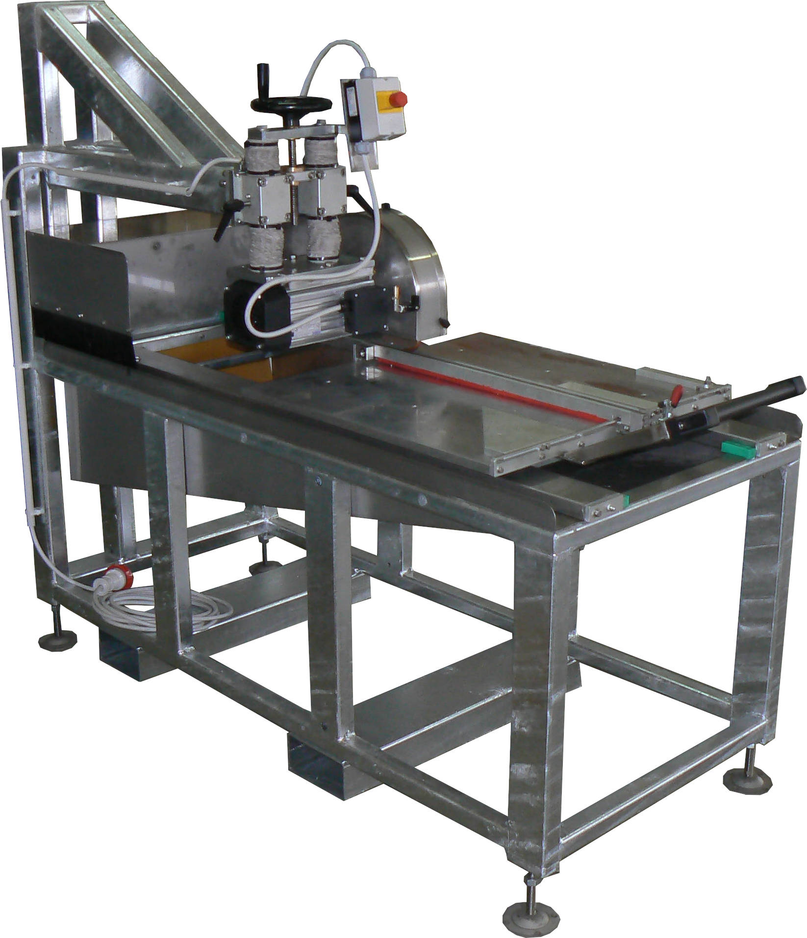 La testa di taglio regolabile in altezza per permettere il taglio di vari spessori, motore da 4HP. Vasca di raccolta e carter disco in acciaio inox, con telaio zincato a caldo.