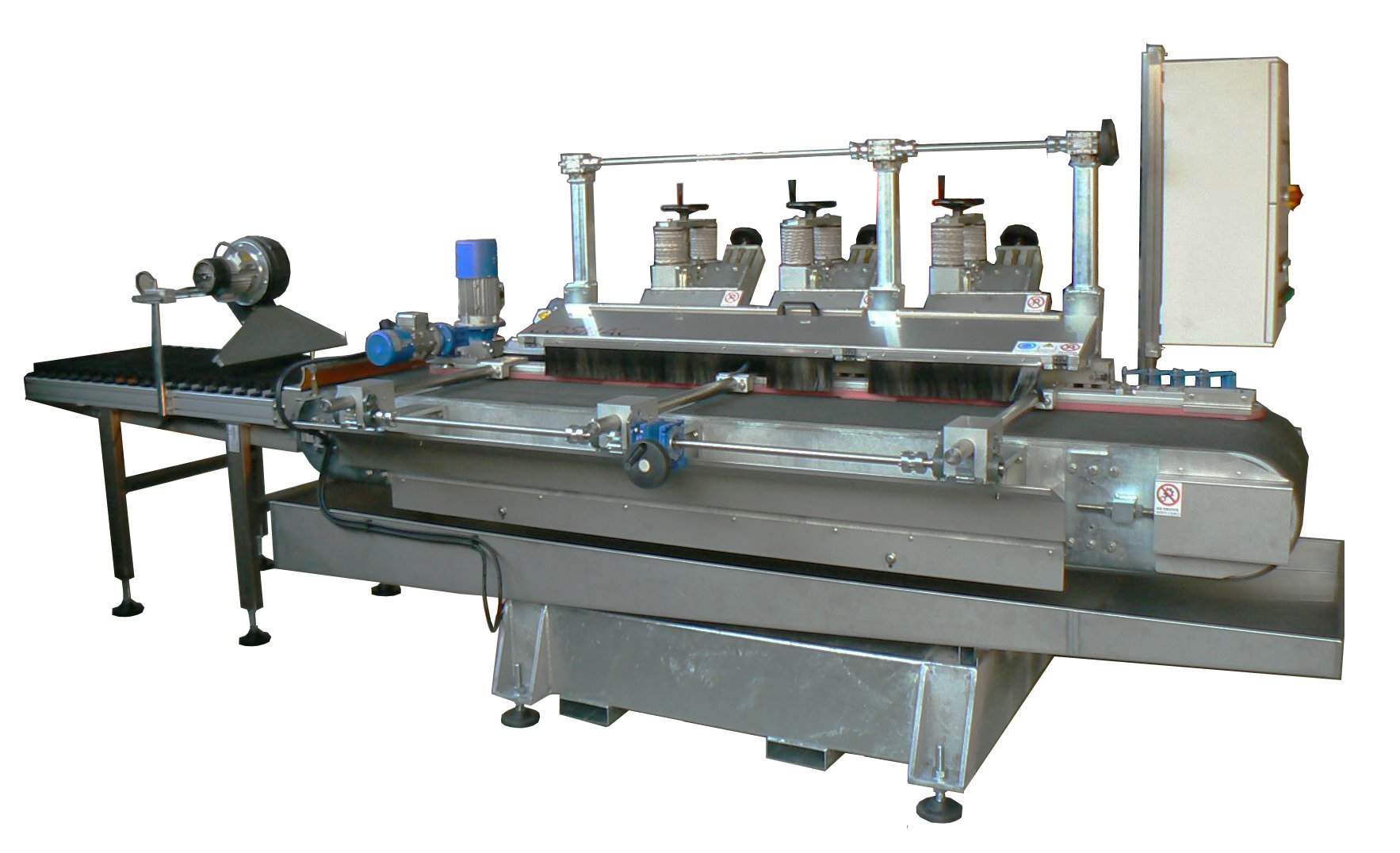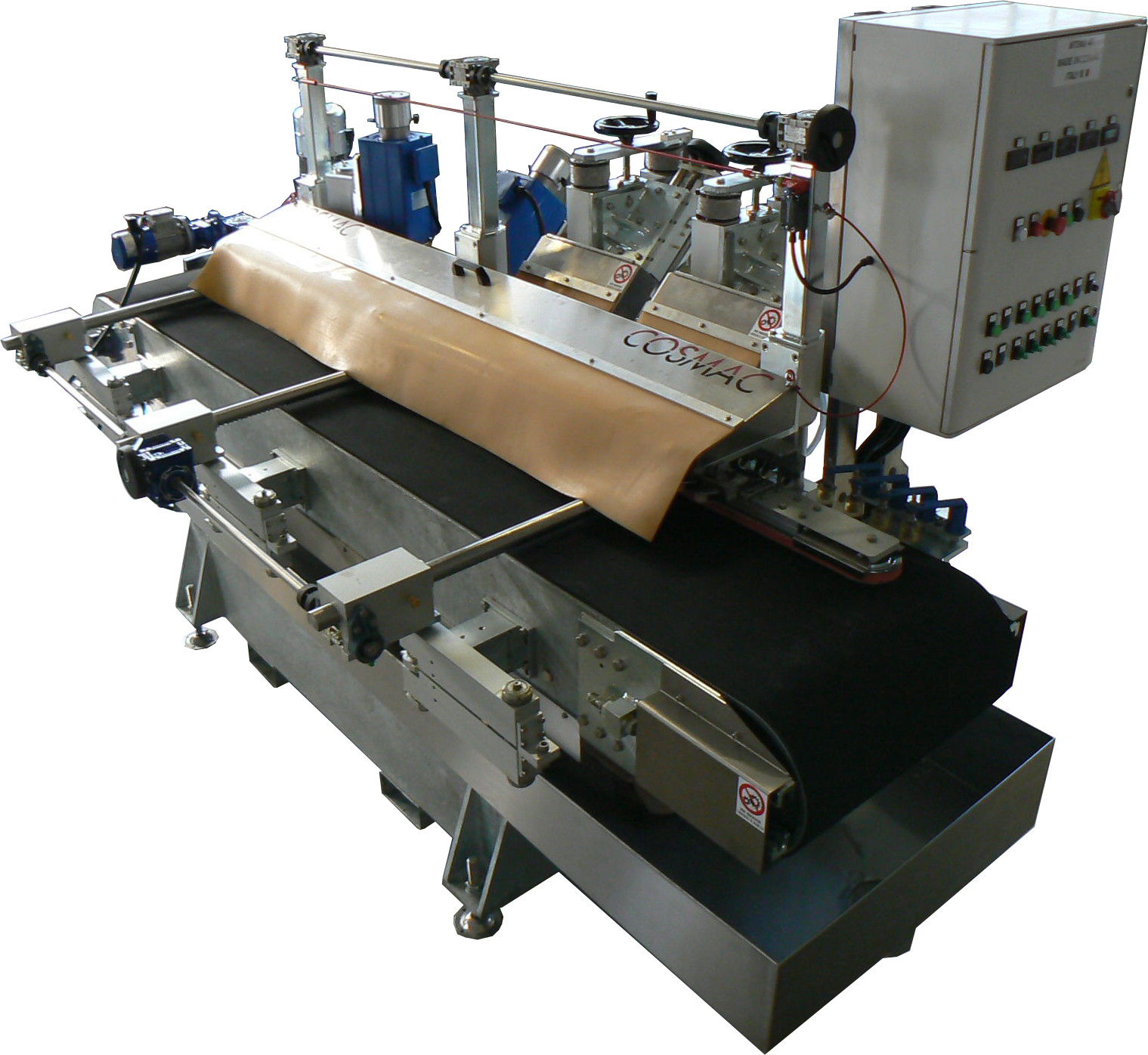 Questo sistema permette la lavorazione anche di piccoli formati; il trasporto del materiale è per mezzo di nastro a velocità variabile, il materiale viene guidato a tutta lunghezza con cinghia motorizzata a velocità sincronizzata con il nastro di trasporto.