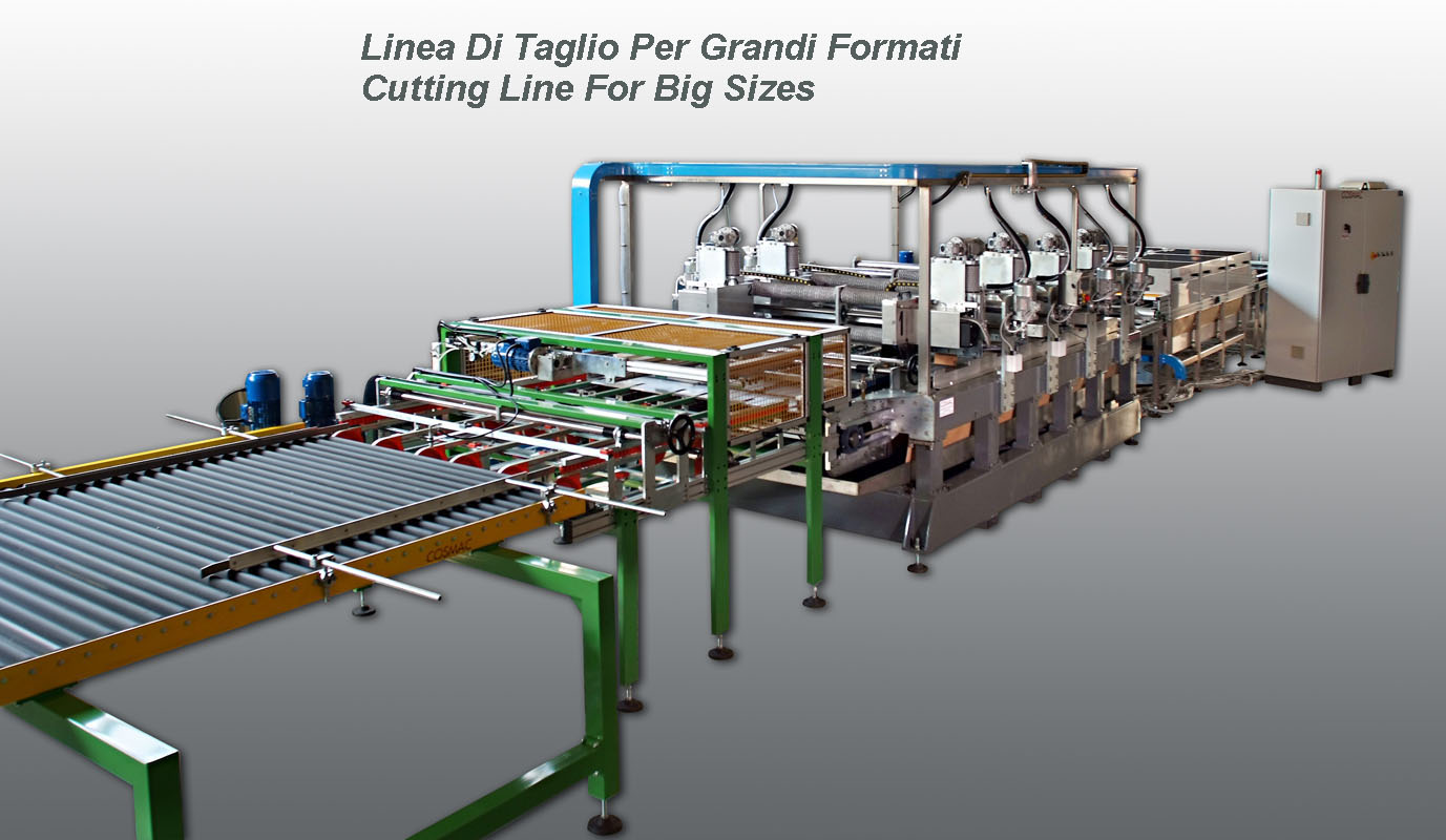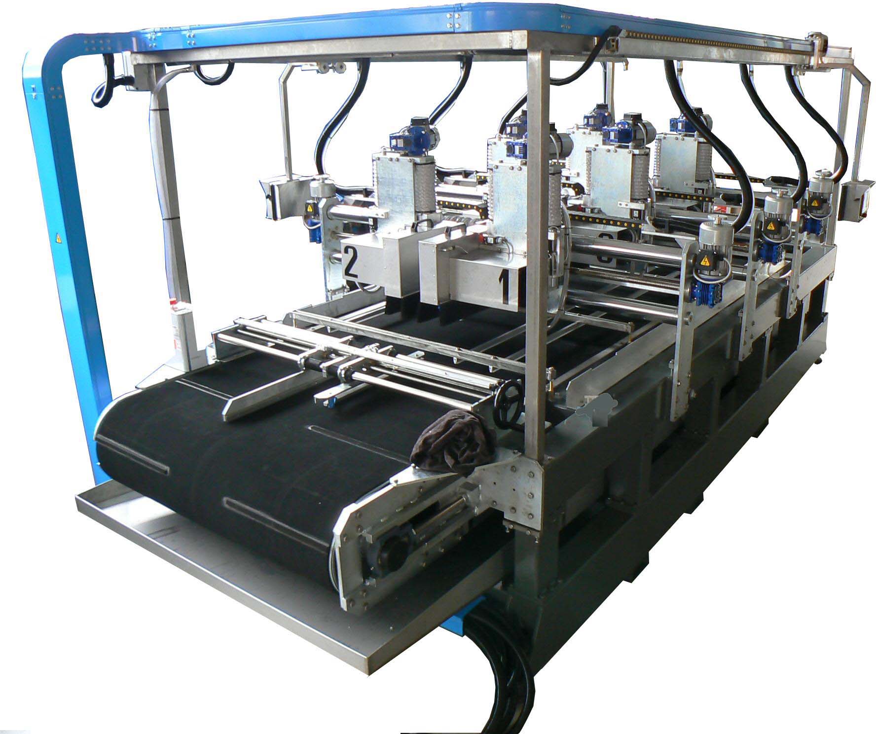 Máquina de corte para grandes tamaños, con cinta de embalaje disponibles en varios tamaños. La máquina dispone de 6 cabezales de corte, cada uno de los cuales tiene una potencia de 4 kW. En la máquina, de forma opcional, puede requerir la colocación automática de los cabezales de medición, mediante el establecimiento del cuadro eléctrico en la pantalla táctil.