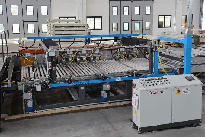 Line cutting and chamfering large format, from loading and processing. The fully automated unit size and finishes the large slabs into tiles of different sizes.
